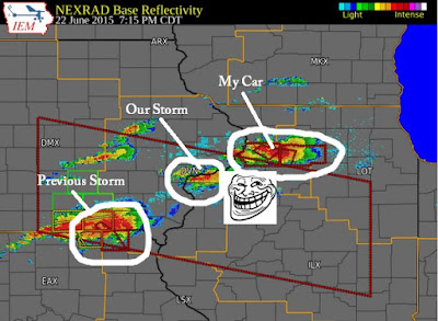 We noticed clearing and a CU field going up in central Iowa with a pocket of 5,000 cape working its way North. We agreed to keep trekking West and found ourselves sitting at the Iowa I-80 truck stop where we bumped into Ben McMillan and the Iowa Storm Chasing Network crew. At this point, I was really beginning to lose hope as it was now going on 4pm with a high stratus deck and light rain falling. Storms finally initiated South of Des Moine and we patiently waited in Iowa City picking our move. The storm was struggling to get organized, but it was the only game in town, and it was also over 100 miles away. We would make it to just Southwest of Washington, Iowa before calling off the chase and turning around towards a developing storm near the outflow boundary and with better backed winds. At this point, I thought 100% for sure we are going to bust now. We missed a strong tornado on the southern storm and the rest of the storms looked like garbage. We unfortunately lost Alec and Jason in Washington from a detoured road and they didn't know we turned around. They continued South as we fled North.